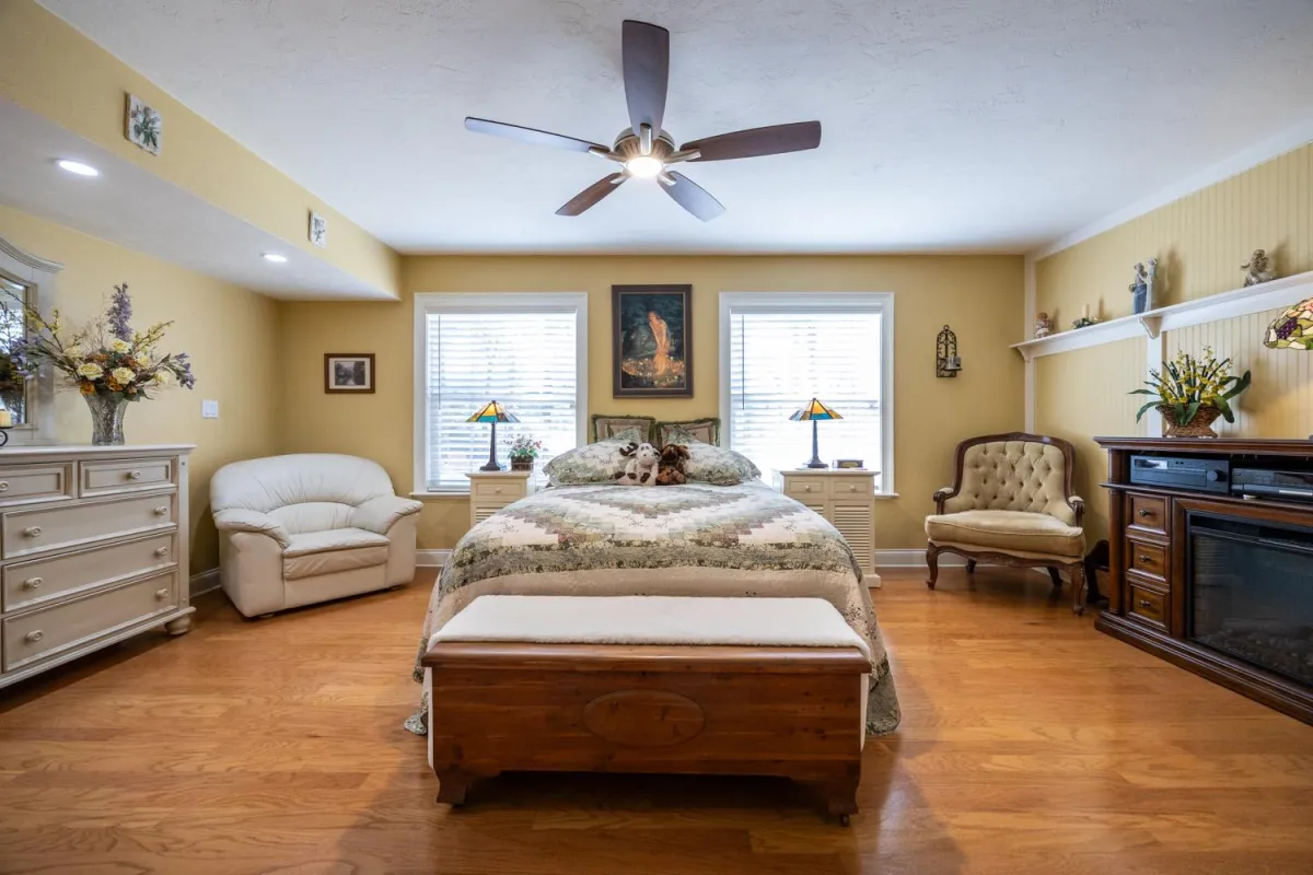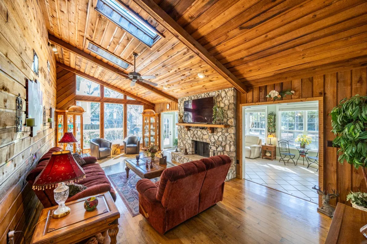 The open floor plan includes a family room with cedar walls and a stunning floor-to-ceiling wood-burning limestone fireplace. The sun is gorgeous on the real wood floors as it comes through an enormous window wall.