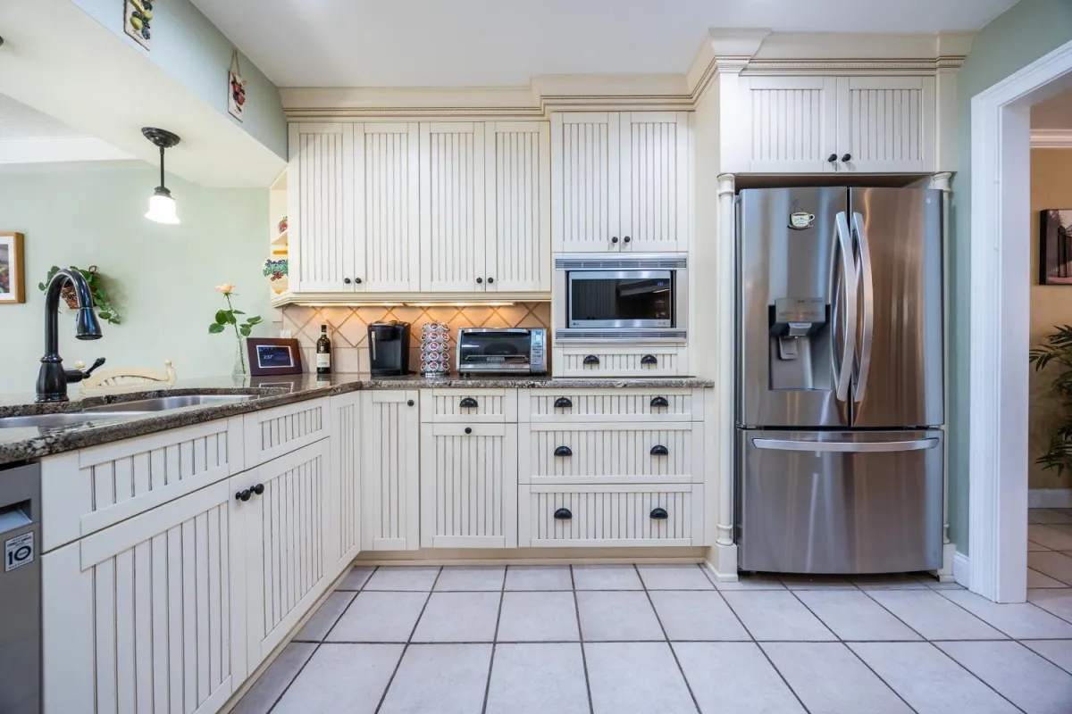 The custom kitchen features granite countertops, ample cabinet space, a large pantry with electrical outlets, and high-quality LG appliances, including a Wi-Fi-enabled counter-depth refrigerator and a 5-burner stove with an air fry feature in the oven.